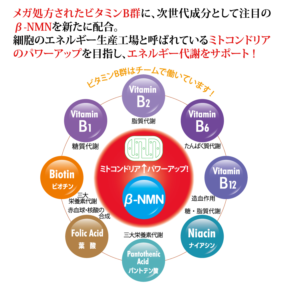 ①メガ処方されたビタミンB群に、次世代成分として注目のβ-NMNを新たに配合。細胞のエネルギー生産工場と呼ばれているミトコンドリアのパワーアップを目指し、エネルギー代謝をサポート します。