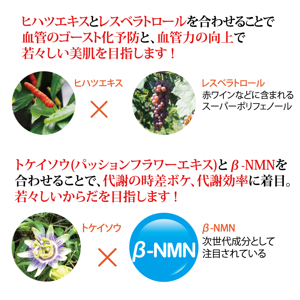 ③ヒハツエキスとレスベラトロール(赤ワインなどに含まれるスーパーポリフェノール)を合わせることで、血管のゴースト化予防と、血管力の向上で若々しい美肌を目指します。